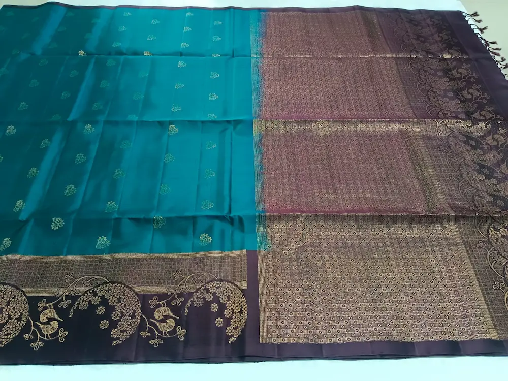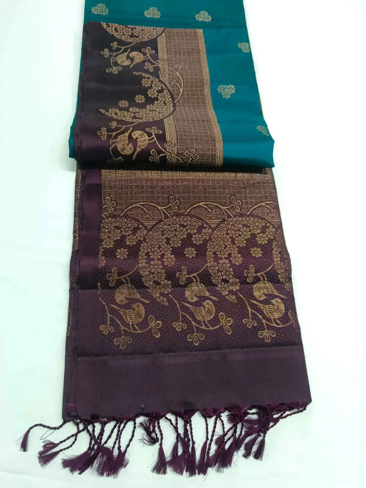 The intricate weaving pattern adds a luxurious texture, while the subtle zari border enhances its royal charm without overpowering the look. Perfect for festive occasions, weddings, or cultural celebrations, this saree blends classic heritage with modern allure.